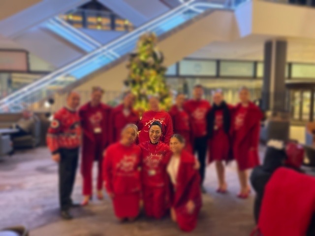 ヴァージンアトランティック航空では、以前は自前のクリスマスセーターや着ぐるみ、髪飾り、機内装飾まで自由でしたが、近年は規定が厳しくなり、会社支給の限定クリスマストレーナーのみの着用に。おそろいのトレーナーに着替え、いざボーディングです。