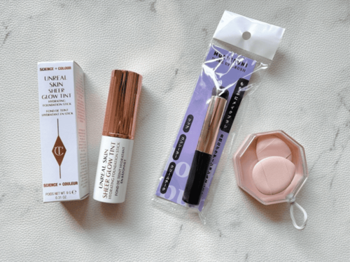 最近お気に入りのファンデーションは、Charlotte Tilbury Unreal Skin Sheer Glow Tint Hydrating Foundation Stick。下地で4割は整っている状態なので、このスティックファンデーションを必要な部分だけブラシや指でのせ、100円ショップでも売っている部分用のクッションファンデスポンジで密着させます。薄膜グロー肌を作るにはこの“密着させる”工程がとにかく大事、この動作をきちんとすることによって自分本来の肌のような素肌感と内側から光るツヤ肌を演出できます。 |